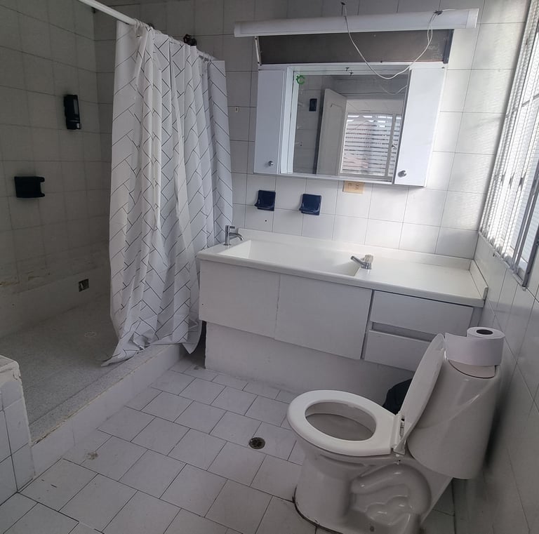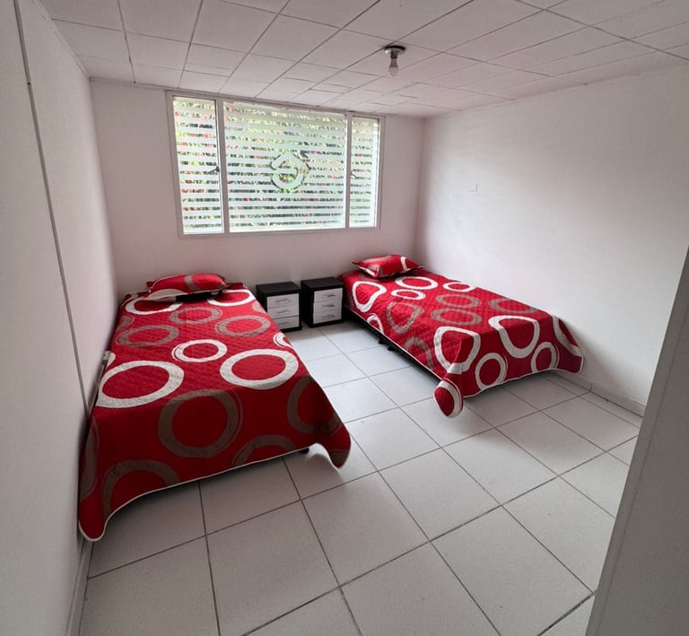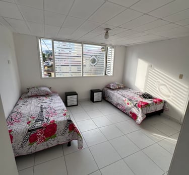 Dispone de 2 camas individuales y 2 nocheros, baño externo con ducha caliente, closet amplio, vista al antejardín, ubicada en el segundo piso