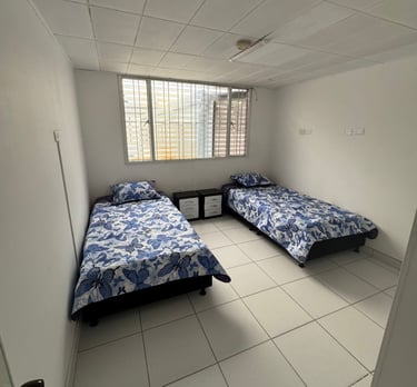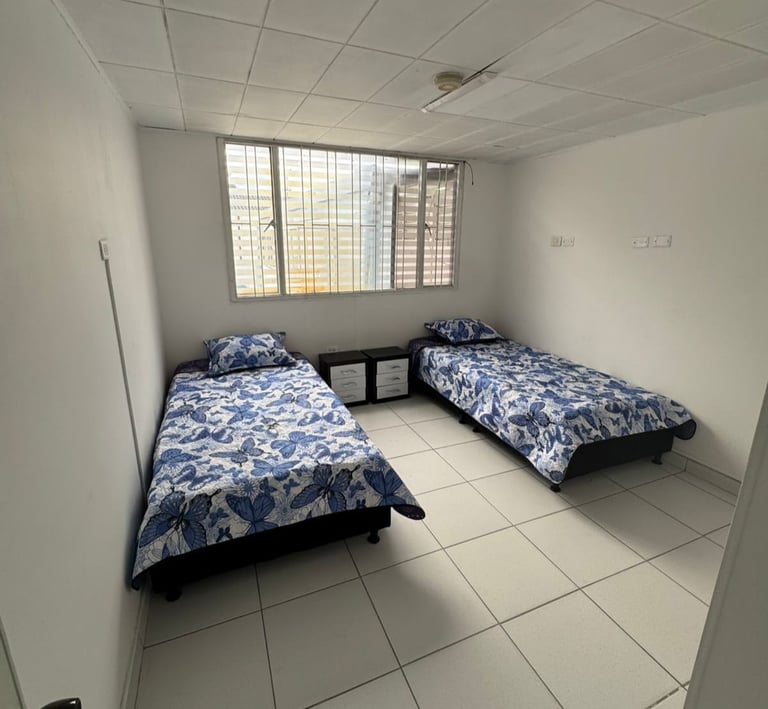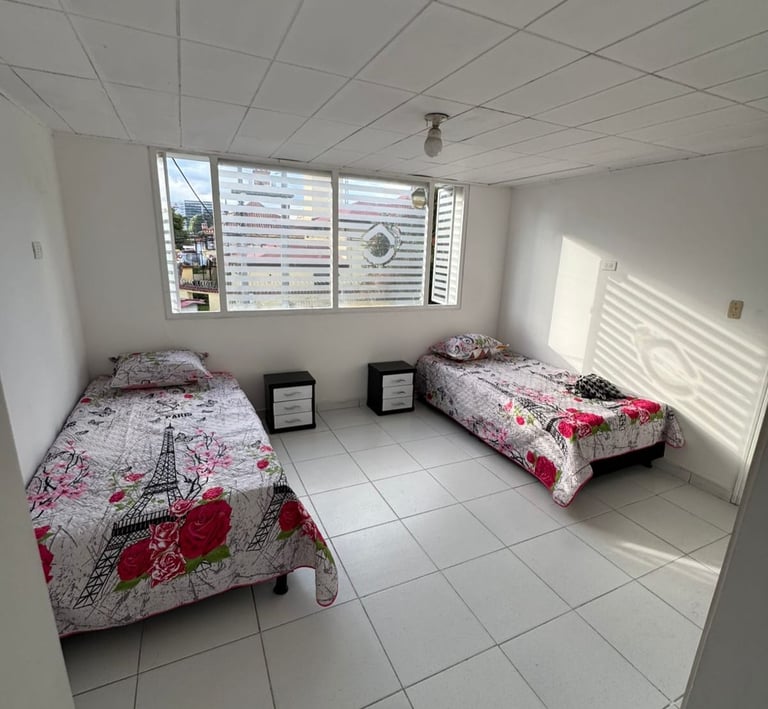Dispone de 2 camas individuales y 2 nocheros, baño externo con ducha caliente, closet amplio, vista al patio interno, ubicada en el segundo piso